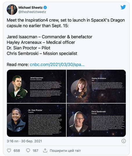 Зазначимо, що всі чотири місця в першому туристичному польоті корабля Crew Dragon викупив 38-річний мільярдер з США Джаред Айзекмен, який захоплюється пілотуванням реактивних літаків. Разом з Айзекменом в космос полетять 29-річна лікар з дитячої лікарні Хейлі Арсеної, 51-річна професор геології Сайен Проктор і 41-річний фахівець аерокосмічної компанії Lockheed Martin Крістофер Семброскі.