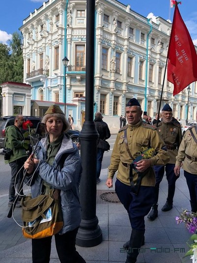На третьому знімку - кілька людей у військовій формі часів Другої світової війни і з червоним прапором.
