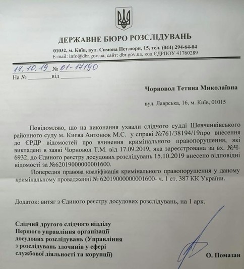 Чорновол опублікувала офіційні відповіді ДБР проо відкриття розслідувань щодо Портнова