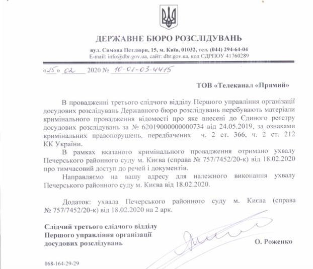 У вівторок 3 березня телеканал «Прямий» отримав ухвалу Печерського районного суду м. Києва, відповідно до якої канал зобов'язаний до 18 березня надати слідчим ДБР, тимчасовий доступ до речей та документів (з можливістю їх вилучення). Про це повідомляє «Прямий» та зазначає, що таку ухвалу суду телеканал вважає незаконною та необґрунтованою, та такою, що постановлена незаконним складом суду, адже належним судом для розгляду даного клопотання є Шевченківський районний суд міста Києва. ДБР знаходиться поза межами територіальної юрисдикції Печерського районного суду міста Києва.