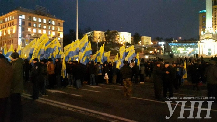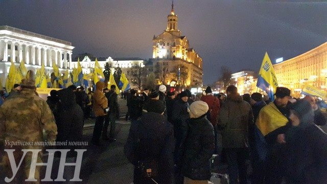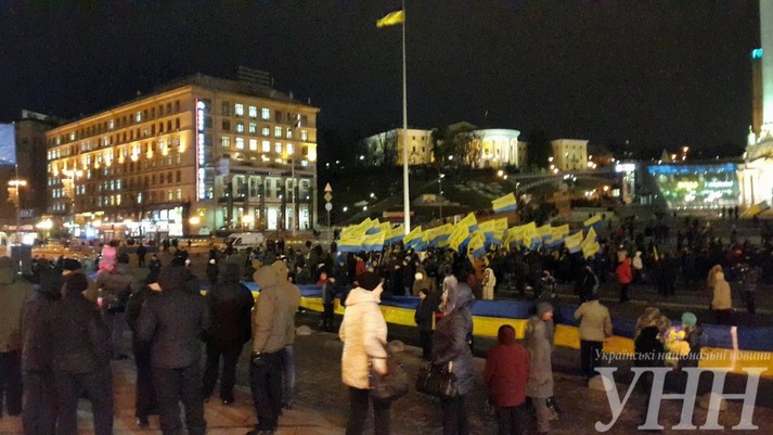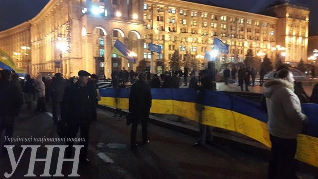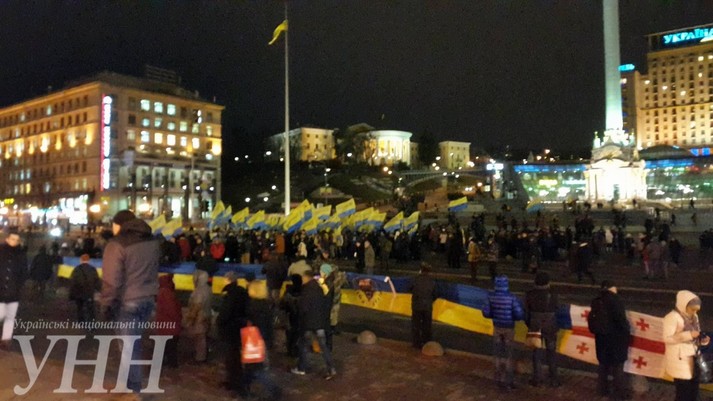 У центрі столиці люди збираються на акцію до річниці початку Євромайдану. Як повідомляють ЗМІ, люди розгорнули великий жовто-блакитний стяг.