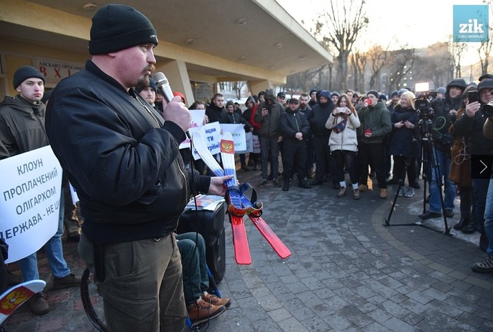 «Хочемо передати ці символічні лижі Зеленському. Бо, як відомо, він у 2014 році готовий був йти і ставати на коліна перед Путіним, благати його, щоб він не нападав і тому подібне2, – сказав керівник «Правого сектору» у Львівській області Тарас Хамер.