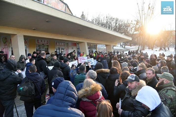 Близько сотні учасників АТО, громадських активістів та представників «Правого сектору» зібралися під стінами Львівського державного цирку, аби висловитись проти Володимира Зеленського як кандидата у президенти.