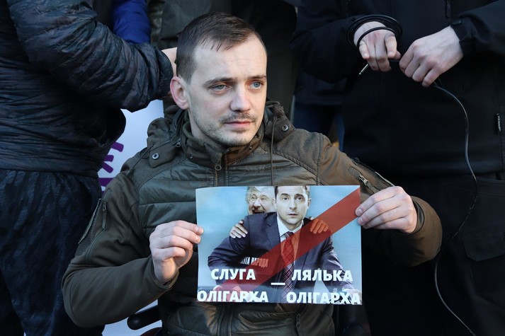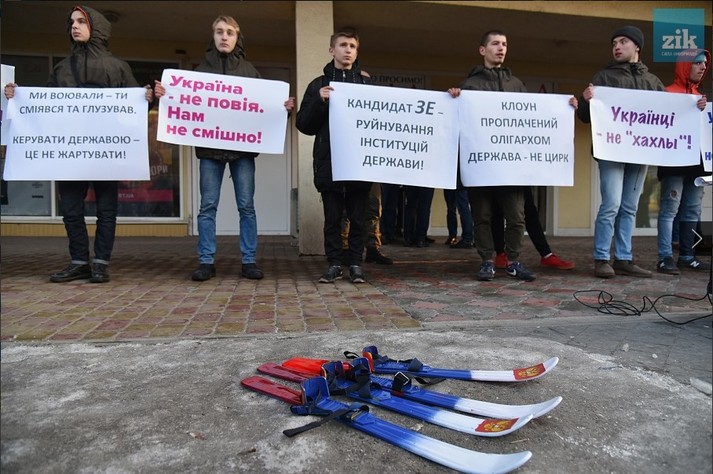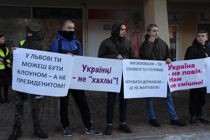 Учасники акції протесту тримали у руках плакати із написами «Слуга олігарха – лялька олігарха», «У Львові ти можеш бути клоуном, але не Президентом», «Ми воювали – ти сміявся та глузував», «Клоун проплачений олігархом. Держава – не цирк».