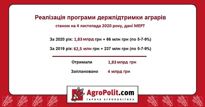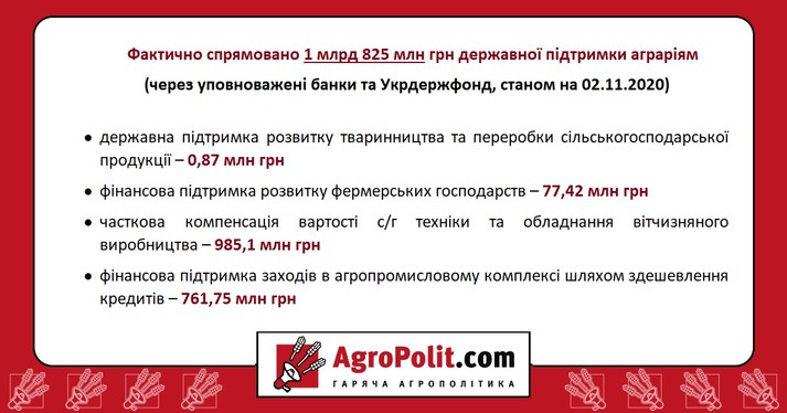 Отже, станом на 2 листопада аграріям фактично спрямовано бюджетні кошти через уповноважені банки та Укрдержфонд обсягом 1 млрд 825 млн грн (45,6 % від затвердженого річного обсягу асигнувань).