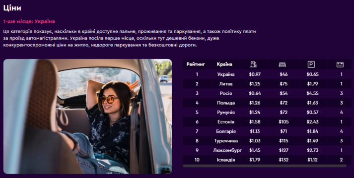 Перше місце за категорією «ціни» зайняла Україна, за нею слідують Литва, Росія, Польща та Румунія. Ця категорія показує, наскільки в країні доступне пальне, проживання та паркування, а також політику плати за проїзд автомагістралями.