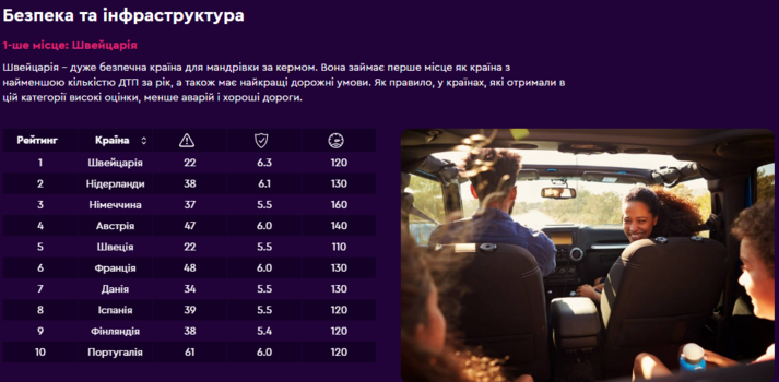 Високі оцінки в категорії «безпека та інфраструктура» отримали Швейцарія, а за нею в рейтингу Нідерланди, Німеччина, Австрія та Швеція. У цих країнах мало аварій і хороші дороги.