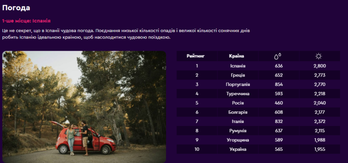 Іспанія посіла першість за категорією «погода». Низька кількість опадів і багато сонячних днів – ось рецепт успіху цієї країни, за нею йдуть Греція, Португалія і Туреччина.