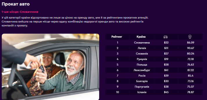 У категорії «прокат авто» відсортовано країни не лише за ціною на оренду, а й за рейтингами прокатних агенцій. Словаччина вийшла на перше місце через вдалу комбінацію недорогої оренди авто та високих рейтингів компаній з прокату. Також до п’ятірки увійшли Латвія, Словенія, Румунія та Польща.