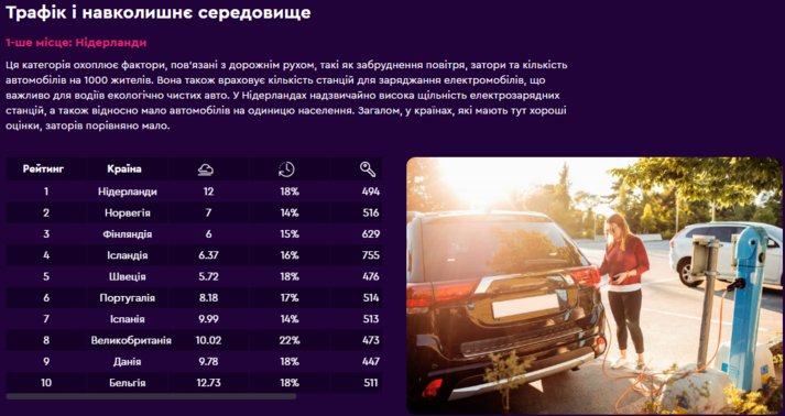 Категорія «трафік і довкілля» оцінює рівень забруднення повітря, затори та кількість автомобілів на 1000 жителів. Вона також враховує кількість станцій для заряджання електромобілів, що важливо для водіїв екологічно чистих авто. Тут перше місце посіли Нідерланди, а на другому місці Норвегія, за ними йдуть Фінляндія, Ісландія та Швеція.