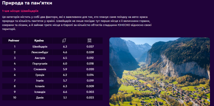 Momondo.ua проаналізував понад тридцять країн Європи, оцінивши їх за шістьма категоріями: погода, безпека та інфраструктура, ціни, трафік та довкілля, прокат авто, природа та пам’ятки.