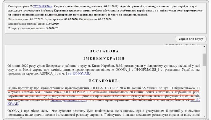 Тоді на неї склали адміністративний протокол, але в суді, де працює її матір із вітчимом, відповідну справу щодо цього інциденту закрили.