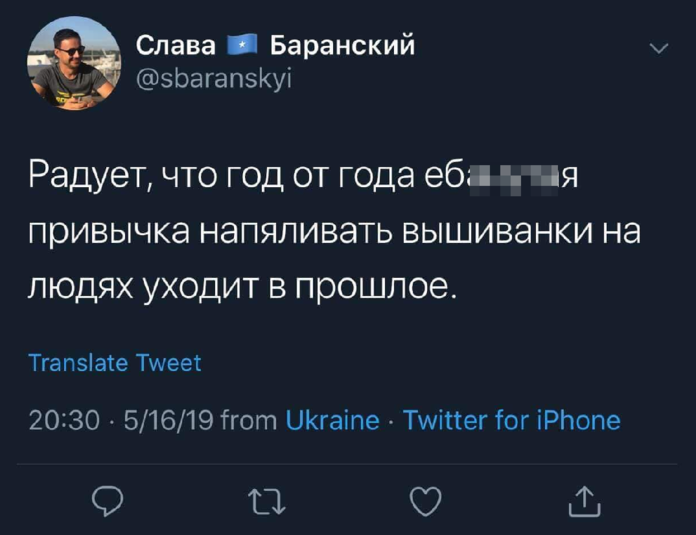 Раніше «Главком» писав, що блогер та спеціаліст із маркетингу Слава Баранський принизив у своєму дописі українців. Скандал почав набирати обертів, коли у мережі почали обговорювати різні висловлювання Баранського.
