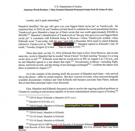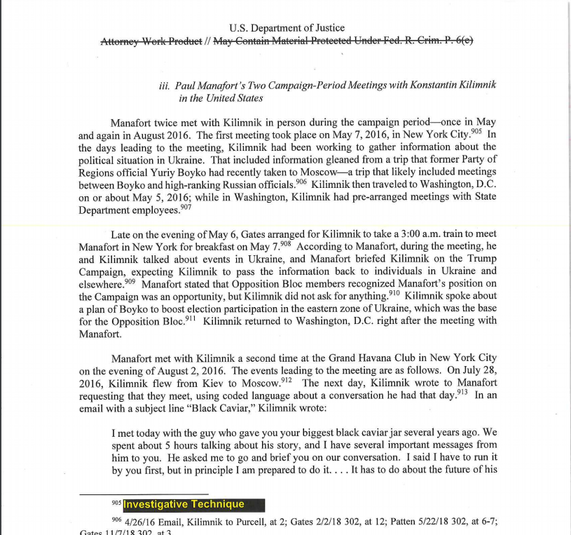 Окрім цього, у доповіді вказується, що у своїх приватних зашифрованих розмовах Пол Манафорт називав президента-втікача Віктора Януковича «чолов’ягою, який подарував мені найбільшу банку чорної ікри».