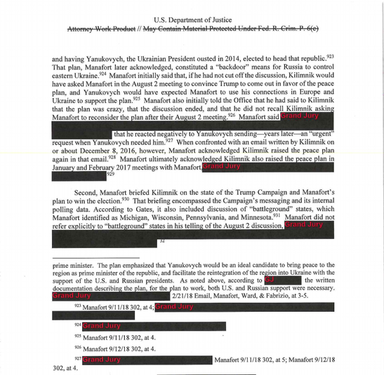 «Повідомлення стосувалося «мирного плану» щодо України, який, як потім визнав Манафорт, мав бути прихованим способом Росії контролювати східну Україну», - йдеться у доповіді.
