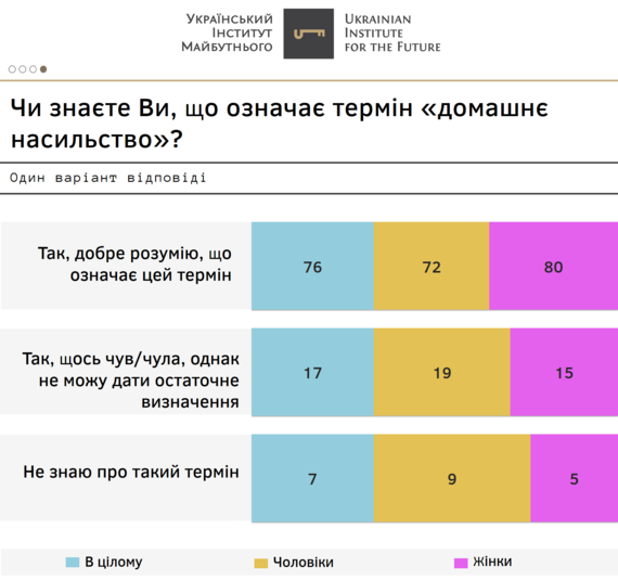 Так, три чверті опитаних громадян стверджують, що добре розуміють, що означає термін «домашнє насильство». Ще 17% хоча б щось чули про нього і лише 7% не знають, що означає цей термін.