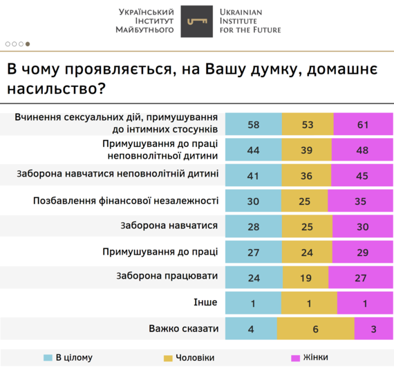 Натомість такі прояви домашнього насильства, як-то заборона навчатися, примушування до праці або заборона працювати, називають вдвічі-тричі менше опитаних.