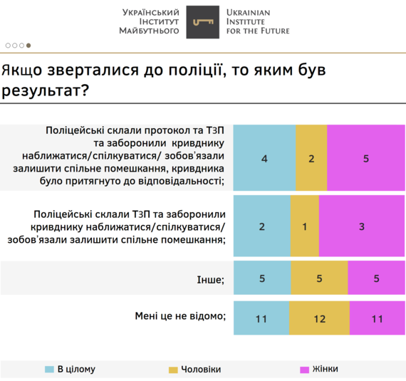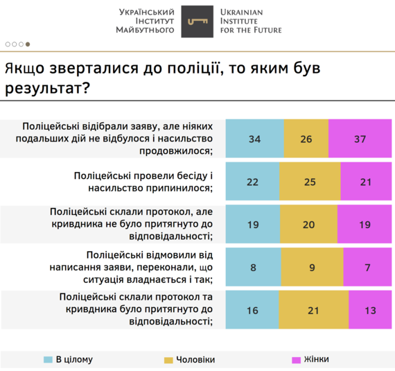 У той же час, 22% стверджують, що поліцейські провели бесіду і насильство припинилося, а 16%, що поліцейські склали протокол та кривдника було притягнуто до відповідальності.