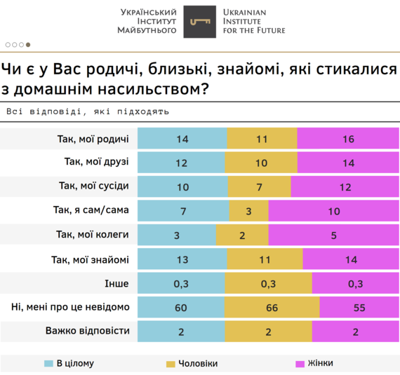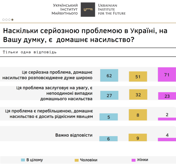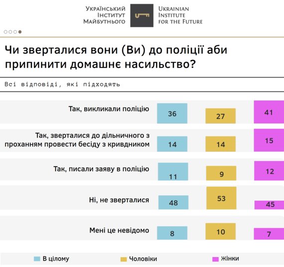 «Наголосимо, що основними причинами відсутності звернення до поліції за фактом домашнього насильства респонденти, яким відомі про такі випадки, називали зневіру, що це щось змінить (43%), небажання виносити сімейні проблеми на люди (34%) та страх, що це спричинить ще більше насильство (28%)», – йдеться у дослідженні.