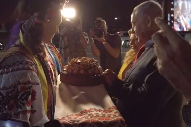 Коли подружжя Нетаньягу зійшло з літака, їх вітали троє дівчат в українському національному одязі та з короваєм.