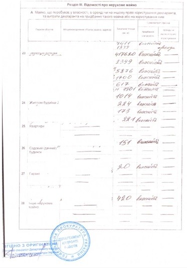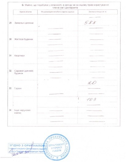 Сам слідчий ГПУ за минулий рік заробив 248 тис грн і зареєстрував численні земельні ділянки та нерухомість. Він має три житлових будинки площею 1014 кв. м, 224 кв. м, 173 кв. м, один садовий – 151 кв. м, квартиру на 221 кв. м, а також інше нерухоме майно площею 420 кв. м.