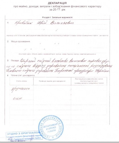 А ось у декларації 2013 р. у власності слідчого Кривобока, крім будинків, значилось інше нерухоме майно площею 8,5 тис кв. м, у 2014 р. – інше нерухоме майно площею понад 10 тис кв. м. У декларації 2015 р. ця нерухомість зникла, але на доходах Кривобока це не відобразилось.