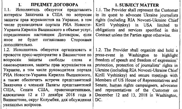 Організація мала «представляти інтереси замовника щодо захисту прав журналістів в Україні, в тому числі керівника порталу «РИА Новости Украина» Кирила Вишинського».