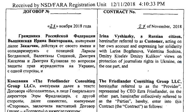 Як пише «Детектор медіа» з посиланням на американський реєстр іноземних агентів FARA, Ірина Вишинська підписала договір з «The Friedlander Consulting Group LLC» 27 листопада 2018 року.