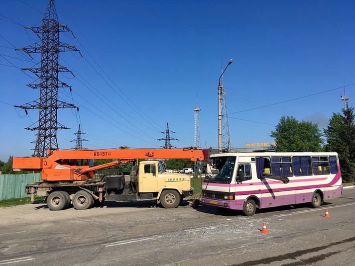 В результаті водій автокрана, здійснюючи маневр, пошкодив стрілою довжиною приблизно 6 метрів передню частину автобуса.
