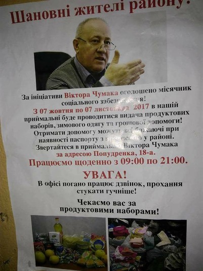 Позафракційний депутат Віктор Чумак у черговий раз став жертвою чорного піару. У Києві розклеїли оголошення, в яких зазначається, що у офісі нардепа з 7-го жовтня по 7-е листопада будуть роздаватися продуктові набори, одяг та грошова допомога.
