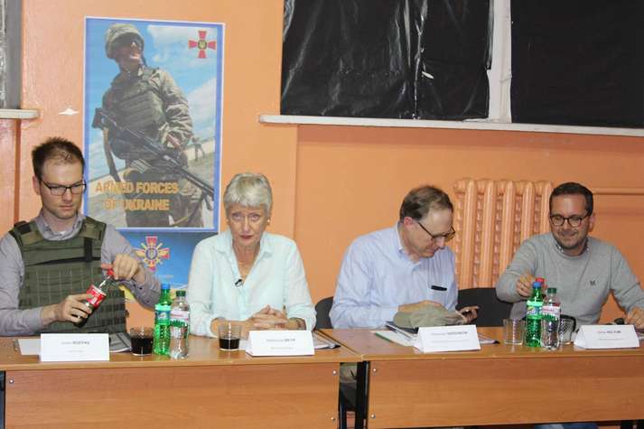 В одному з базових таборів сил АТО високих іноземних гостей зустріли генерали й офіцери штабу АТО, після чого там відбувся брифінг. Представники штабу та СЦКК розповіли присутнім про стан справ у районі проведення антитерористичної операції, а також про порушення російською стороною мінських домовленостей. Крім того, гості змогли на власні очі побачити і те, й інше, побувавши в одній із бригад Збройних сил України, що обороняє ділянку фронту на донецькому напрямку, а також на місцях обстрілів у місті Торецьк.