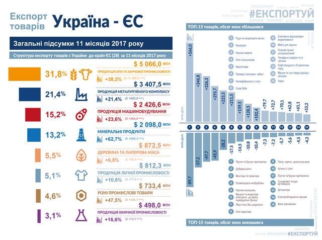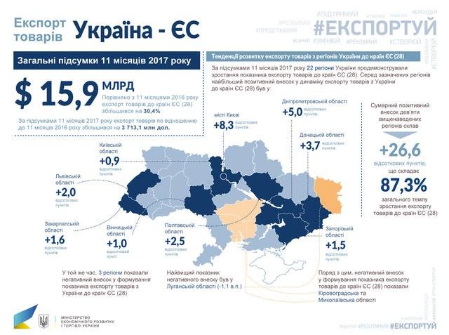 «Країни ЄС є найбільшими торговельними партнерами України. Питома вага цих країн у зовнішньоторговельному обороті товарів України у січні-листопаді 2017 року становила 41,3%. Зовнішньоторговельний оборот товарів з країнами ЄC у січні-листопаді 2017 року збільшився на 26,2% (або на 7,2 млрд дол.) по відношенню до січня-листопада 2016 року і склав 34,7 млрд дол. Експорт товарів до країн ЄС склав 15,9 млрд дол. і зріс на 30,4% (або на 3,7 млрд дол.)», - йдеться в повідомленні МЕРТ.