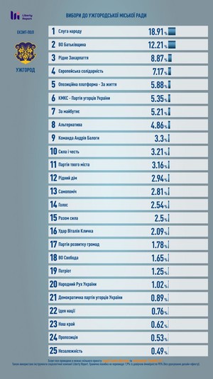 У неділю, 25 жовтня, опублікували результати екзит-полу на виборах мера Ужгорода. Про це свідчать дані екзит-полу на замовлення телеканалу «Україна 24» та програми «Свобода слова Савіка Шустера».