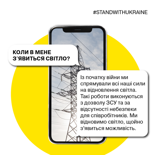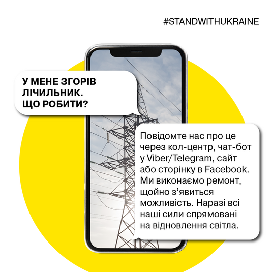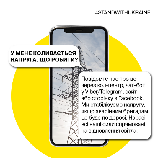 З початком військових дій в Україні фахівці «ДТЕК Київські електромережі» продовжують виконувати свою роботу. Але, якщо попри старання фахівців, у домогосподарстві чи квартирі зникло світло, необхідно повідомити кол-центр за телефонами +38 (044) 202 1588, +38 (067) 210 1588, +38 (050) 210 1588 або +38 (073) 202 1588, чат-бот у Viber або Telegram, на сторінці у Facebook або за допомогою сайту.