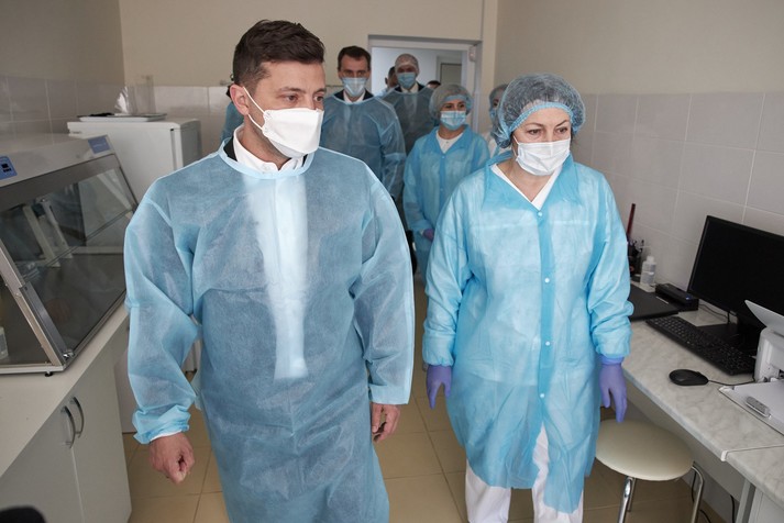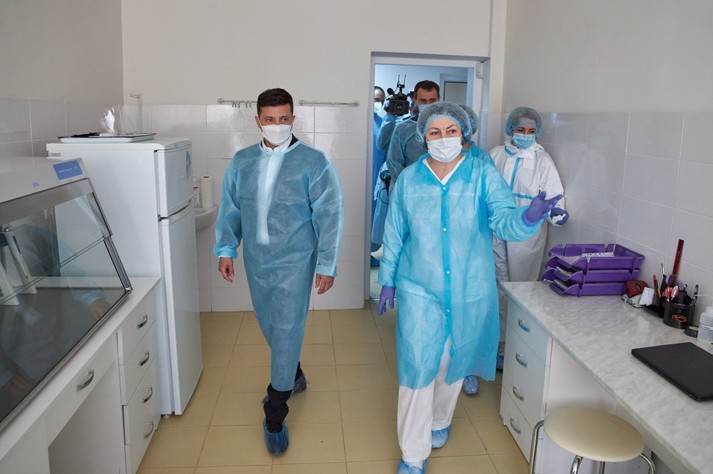 Під час робочої поїздки до Хмельницької області президент України Володимир Зеленський відвідав лабораторію мікробіологічних досліджень ДУ «Хмельницький обласний лабораторний центр МОЗ України». Там глава держави поспілкувався з медиками, а його пресслужба зробила кілька фото, де він разом з лікарями позує в захисних костюмах. Які, своєю чергою, надав цим медикам Фонд Порошенка.