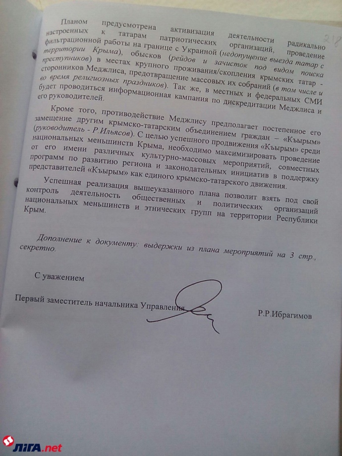 Про це йдеться в таємному листі першого заступника начальника управління ФСБ РФ щодо Криму Рустема Ібрагімова до ставленика Кремля на півострові Сергія Аксьонова від 28 квітня 2015 року, яке публікує ЛІГА.net.