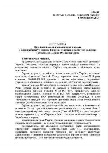 «Відкликати Гетманцева Данила Олександровича, народного депутата, з посади голови Комітету Верховної Ради з питань фінансів, податкової та митної політики ... оскільки продовження його діяльності з розробки проєктів законів з питань оподаткування має на меті припинити незаконні схеми з ухилення від оподаткування та завдати шкоди від цього багатьом поважним людям і тому унеможливлює виконання ним своїх обов'язків», ─ йдеться у проєкті постанови.