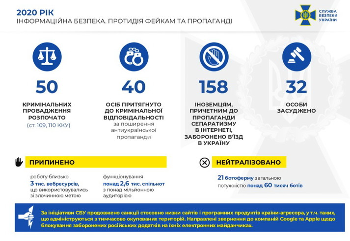 Завдяки роботі кіберфахівців СБУ до кримінальної відповідальності за поширення антиукраїнської пропаганди було притягнуто 40 осіб і ще 32 фігурантів вже засуджено.
