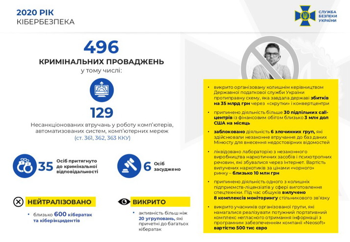 Загалом протягом 2020 року за матеріалами кіберпідрозділів Служби безпеки розпочато 496 кримінальних проваджень. Із них – 129 справ саме за несанкціоноване втручання у роботу комп’ютерних мереж та автоматизованих систем.