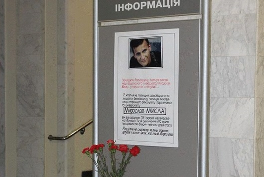Нагадаємо, що раніше інший випускник університету ім. Каразіна Дмитро Прокудін повідомив на своїй сторінці у Facebook, що йому соромно за істфак, оскільки деканат відмовив активістам у проханні розмістити фото і квіти на знак трауру по Мирославу без пояснення причин.