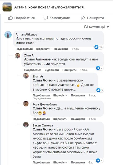 Оскільки у росіян традиційно зарплати були вищі, жителі Казахстану висловлюють невдоволення і занепокоєння можливому росту цін. Загалом у коментарях користувачі дивуються, але вже явно рефреном звучить думка: «Це все наше! Не віддамо!», «Так вони скоро тури по продукти почнуть продавати. І тоді ціни у нас знову збільшаться… А чому Токаєв не закрив кордон? Значить, на словах він проти війни, а насправді ось вам і карти банківські, шопінги… Довго лавірувати неможливо», «Нічого їм продавати! Нехай у валянках ходять!» – цитує Ахунов дописи казахстанців.