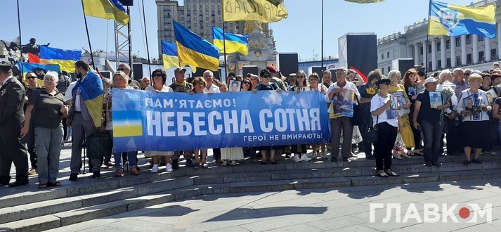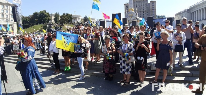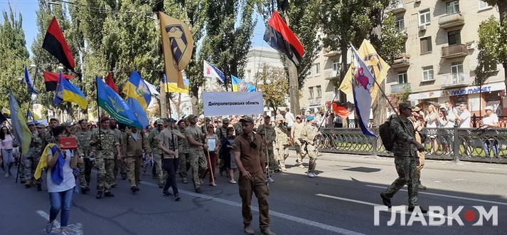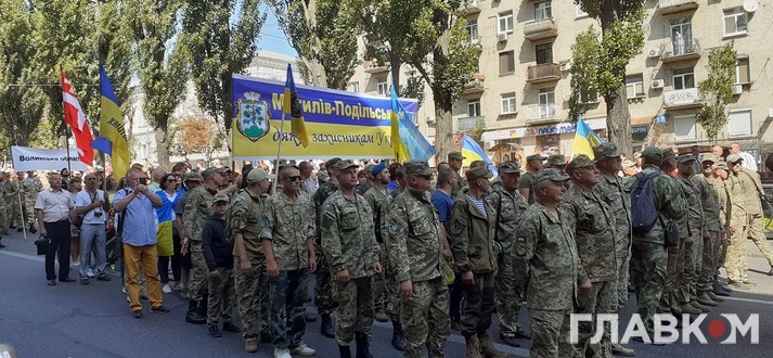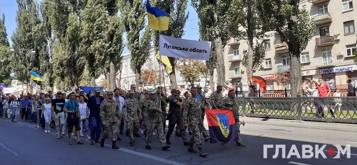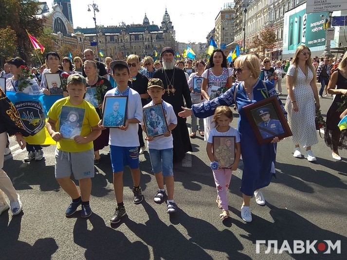 Очолюють ходу близькі і родичі загиблих на Донбасі, потім йдуть ветерани, представники ветеранських організацій та військовослужбовці