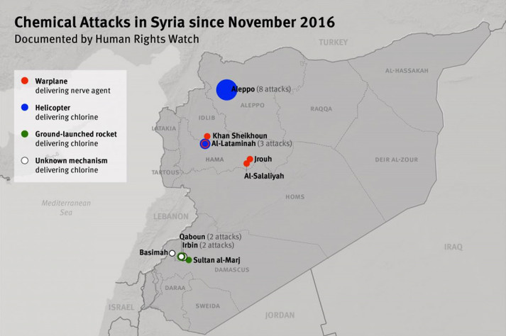 HRW стверджує, що з грудня 2016 року сирійська армія щонайменше чотири рази використовувала авіабомби з отруйними речовинами та розпорошувала гази з гелікоптерів