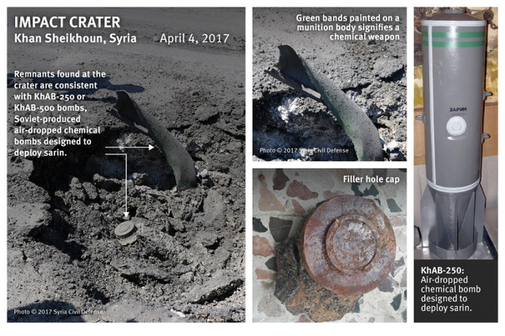 У матеріалі йдеться, що фотографії і відеозаписи, зроблені в Хан-Шейхуні, свідчать про те, що там, імовірно, були використані авіаційні бомби радянського виробництва, які спеціально створили для доставки зарину.