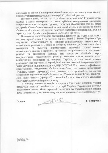 Український інститут національної пам’яті звернувся з листом до дочірнього підприємства «Adidas –Україна» і нагадав про відповідальність за поширення в Україні продукції з використанням заборонених символів комуністичного тоталітарного режиму. Про це повідомила прес-служба Інституту.