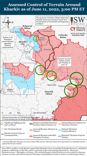 - Російські війська продовжували вести наземні наступи в районі Сєвєродонецька, але українські захисники зберігають контроль над промисловим районом міста станом на 11 червня.