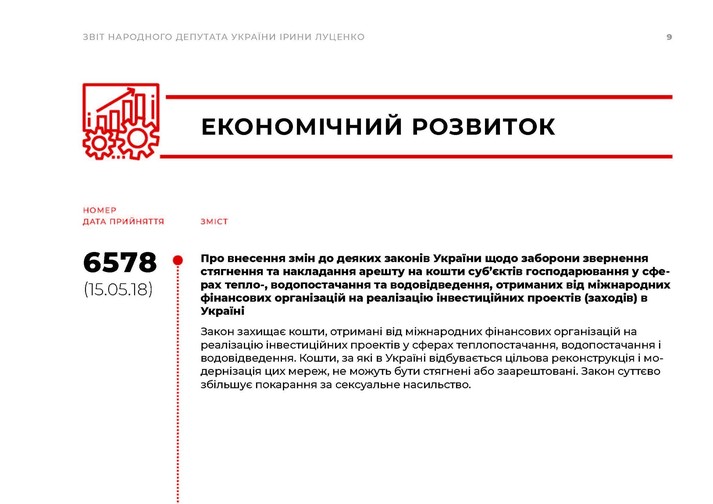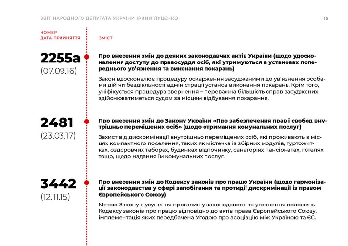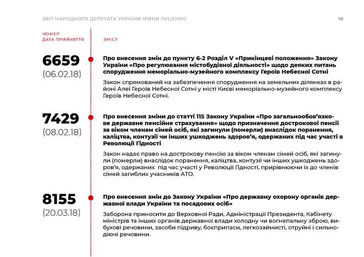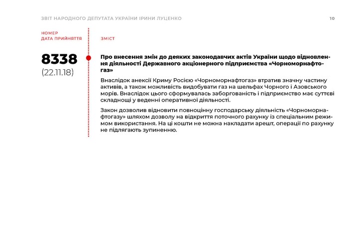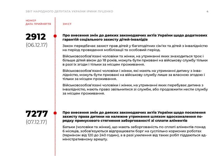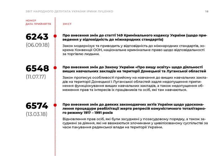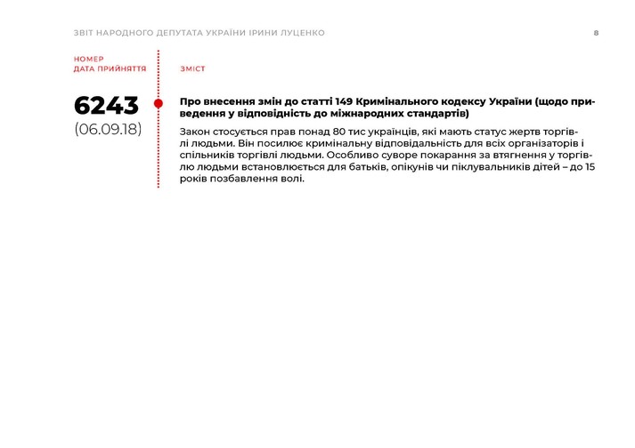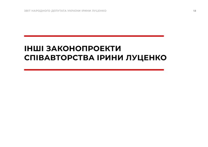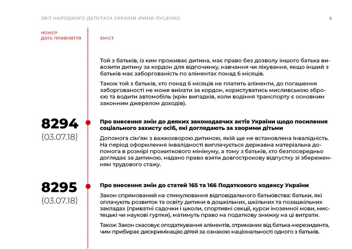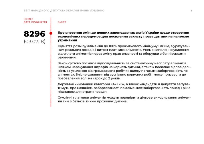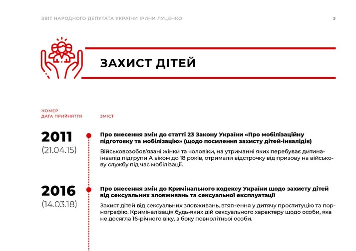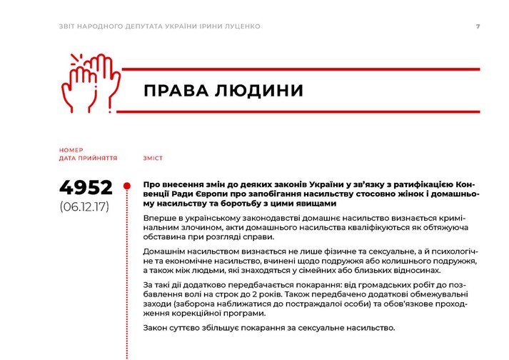 «Я завжди розглядала депутатський мандат як велику відповідальність і можливість долучитися до розбудови країни. Своєю основною місією бачила захист дітей і українських родин, боротьбу з домашнім насильством, захист прав людини. Вперше в українському законодавстві з’явилось таке поняття, як домашнє насильство. Вперше воно визнано кримінальним злочином.Вперше батьки, що забули про існування власних дітей, виплатили на їх користь понад 8 мільярдів гривень аліментів.