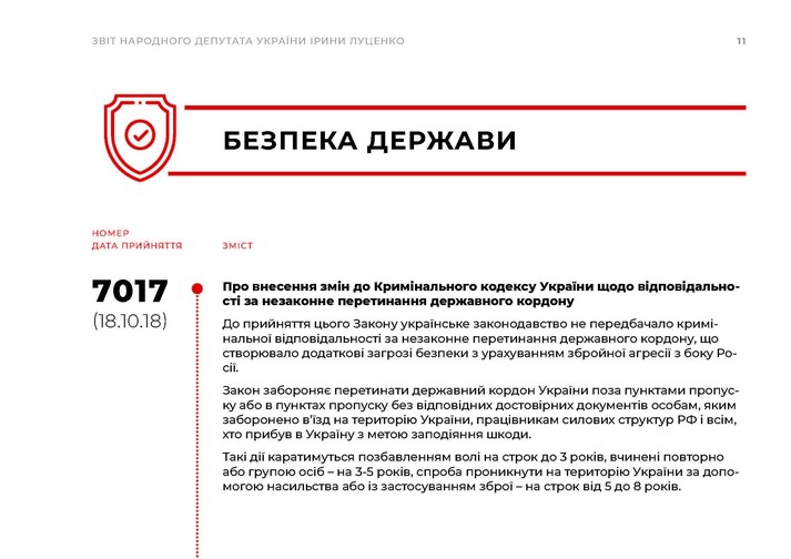 Соратниця Порошенка наголосила, що також пріоритетом її роботи як народного депутата був захист державного суверенітету України. Адже вперше був заборонений доступ до виборів спостерігачам держави-агресора. І вперше незаконний перетин державного кордону України визнано кримінальним злочином.