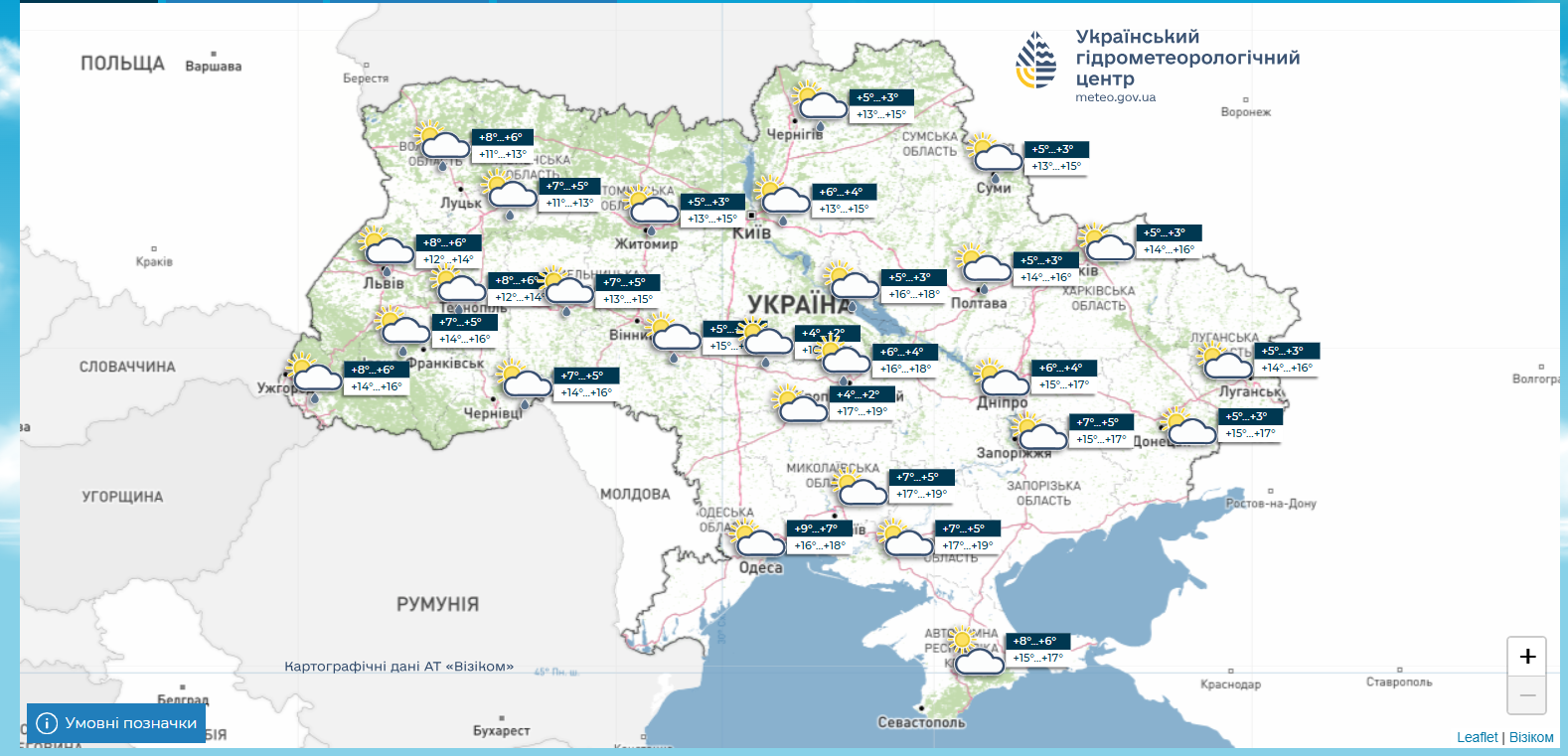 На півдні та південному сході буде трохи тепліше – вночі +1…+6, вдень до +13.
