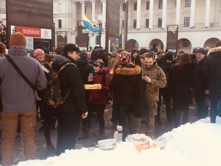 На Майдані зібрались прихильники Порошенка: п’ють каву та їдять торт